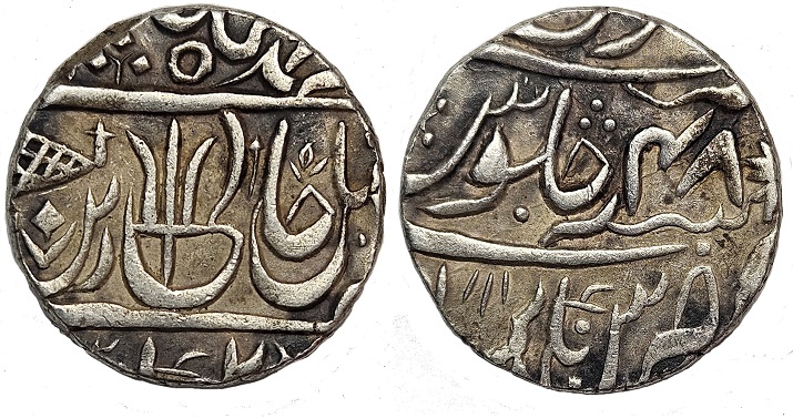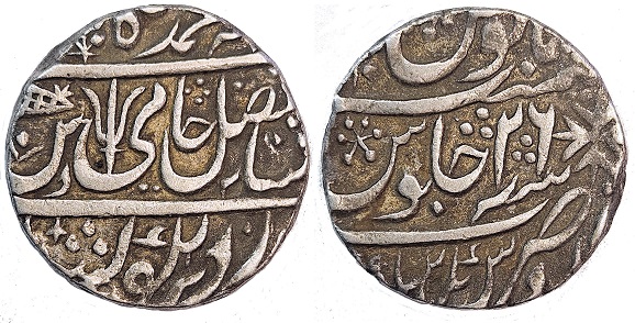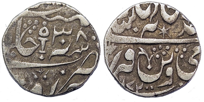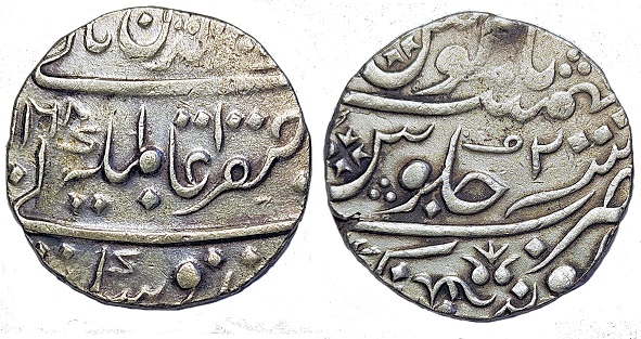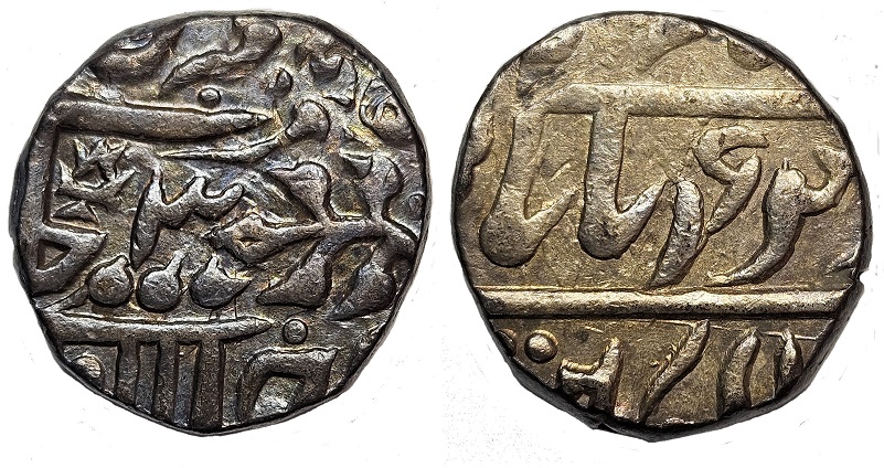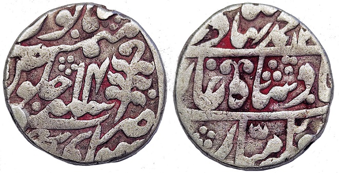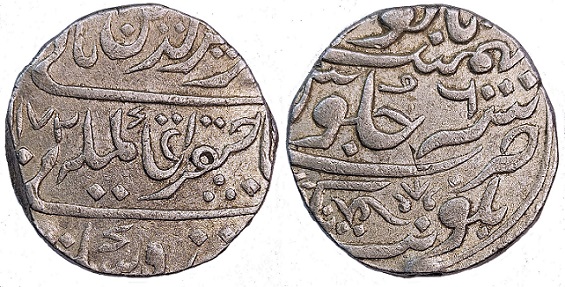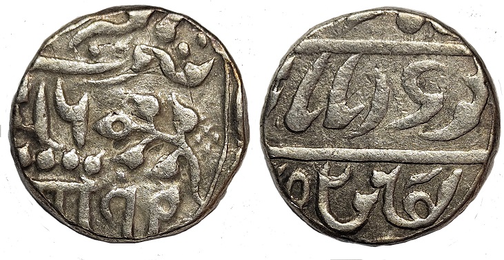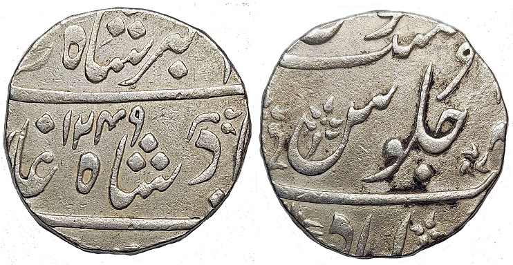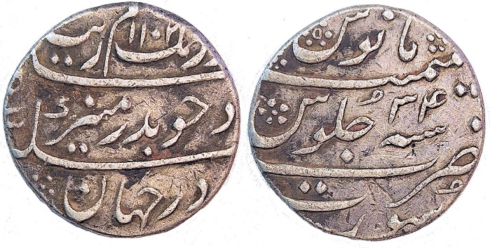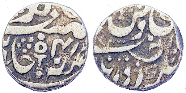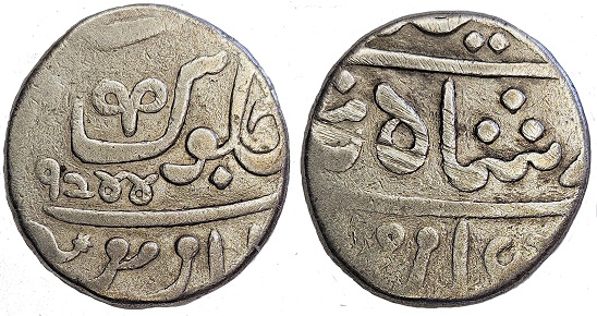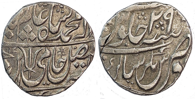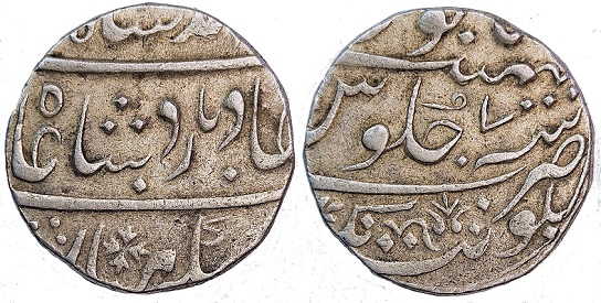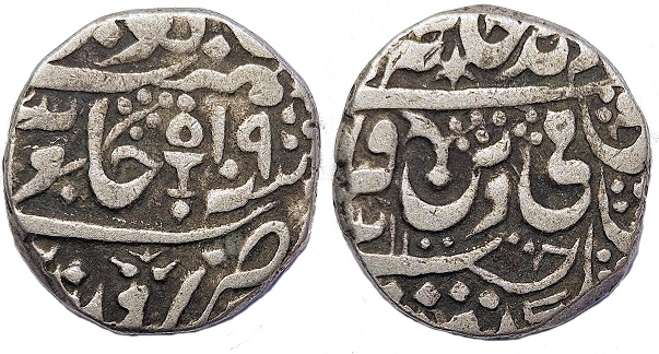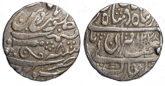 Jahanshi (Balwantnagar) mint Ob. Rev. AH1172 Ry.6 Rupee Silver 11.34g, 22mm KM 143 Zeno #334871 |