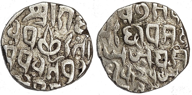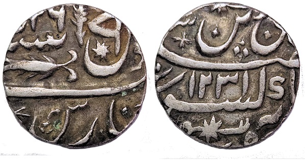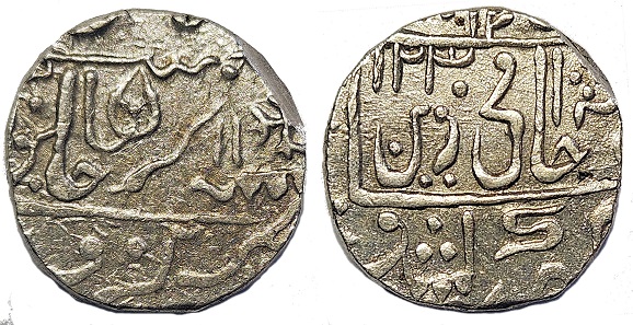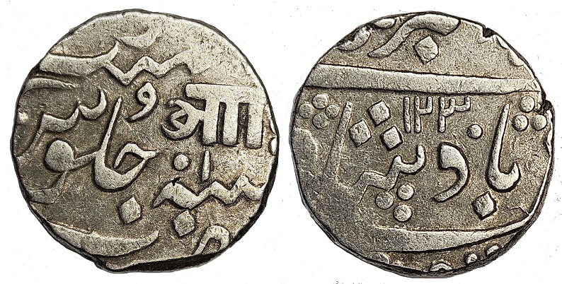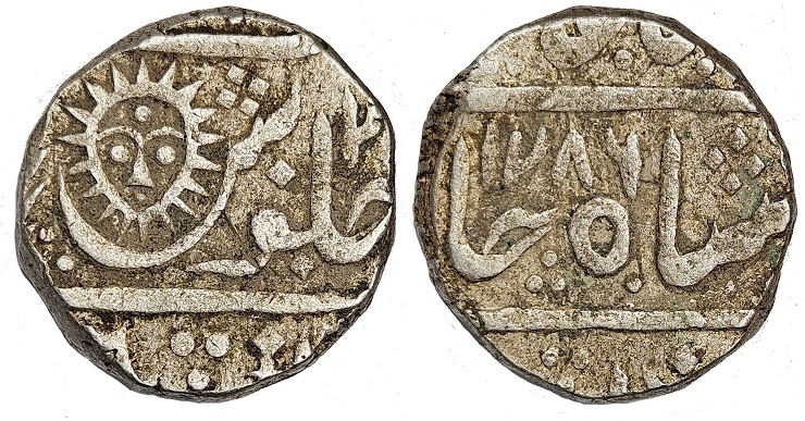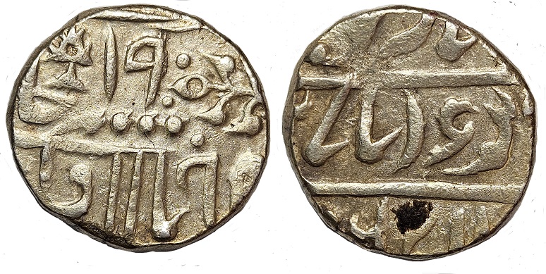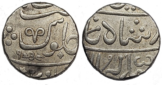 Dar al-Riyasat mint Ob. Sikka Mubarak zad za Fazal-i- Yazdan / Ra’ees-i- Tonk Ibrahim ‘Ali Khan’ (“Struck auspicious coin by the grace of God, Ibrahim Ali Khan, the Elite (king) of Tonk”); Feather/Turban ornament mint mark. Rev. ‘Ahdi malikah muazzam sultanat inglistan wa qaiser hindustan dar al-zarb Tonk’ AH1293 (1876/1877 AD) Rupee Silver mm g KM Zeno #138619 |