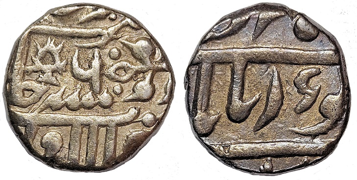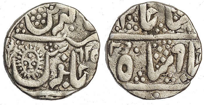 Jahanshi (Balwantnagar) mint Ob. Rev. AH1168 Ry2 Rupee Silver 22mm, 11.34g KM 143 Zeno #343056 |