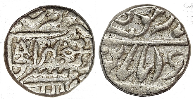Maler Kotla (Sahrind on coin) mint Ob. Rev. ND Rupee Silver 28mm, 10.05g KM Zeno #324356 |