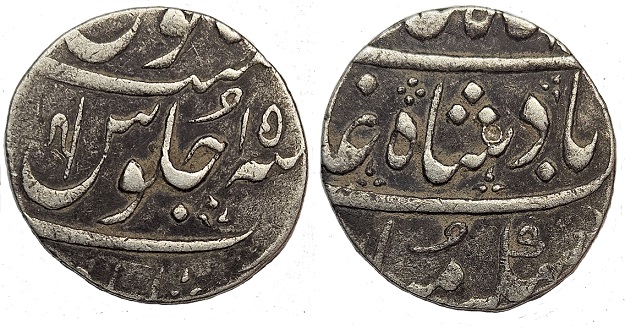 Shahjahanabad mint (Dar al-Khilafat) Ob. julus maymanat ma'nus Rev. Shah 'A(lamgir) or 'A(lam) / badshah ghazi/sikka mubarak. AH1178 Ry.(6) (1764/1765 AD) Mehtashahi Rupee Silver 20mm, 11.15g KM C38, Zeno #162136 |