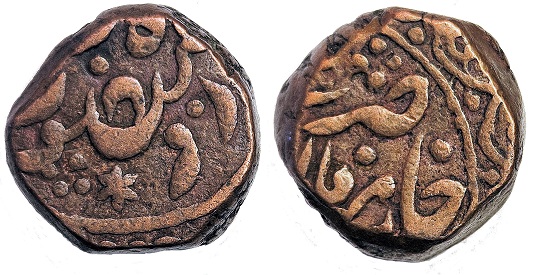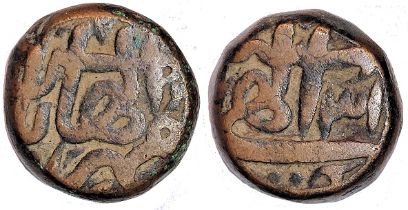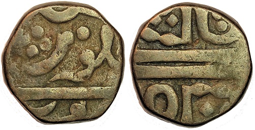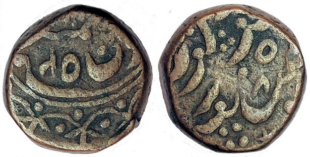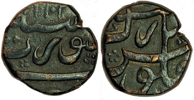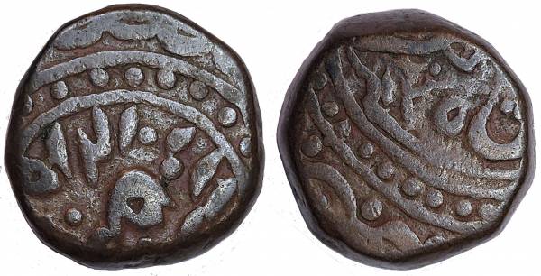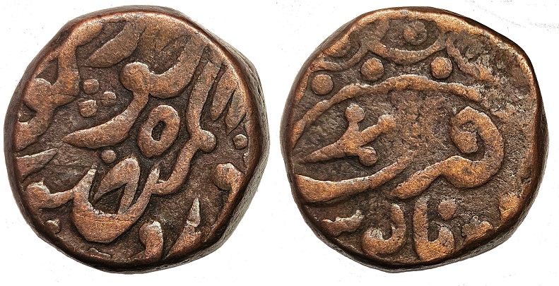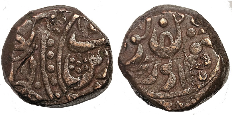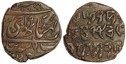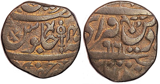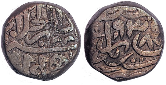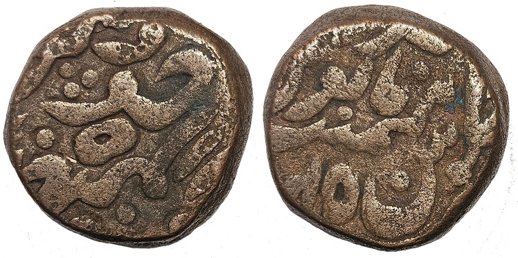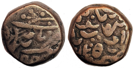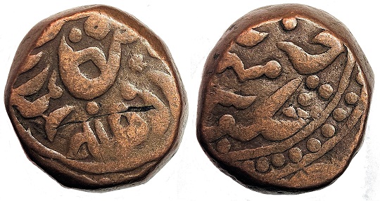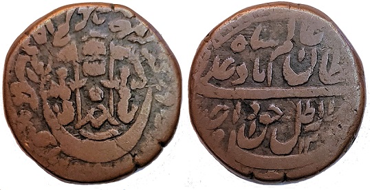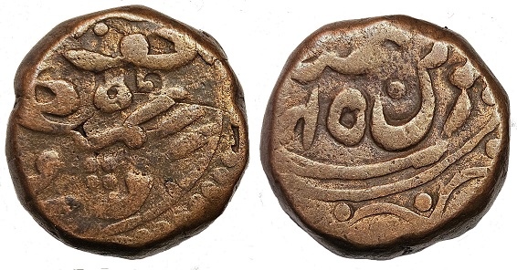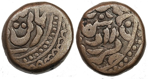 mint: Dehli, Narnol Ob. Rev. AH- AE half Dam 10.41g, 15mm KM; mintage: Edge - Engraver: Zeno #324210 |