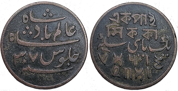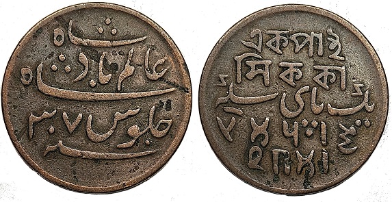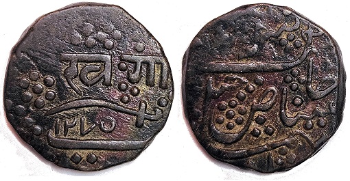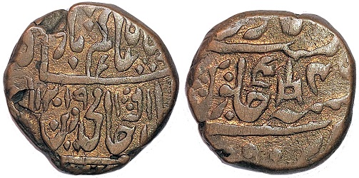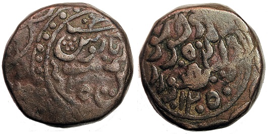 mint: Dehli, Hazrat mint Ob. Rev. AH- AE half Dam 10.14g, 16mm KM; mintage: Edge - Engraver: Zeno #324337 |