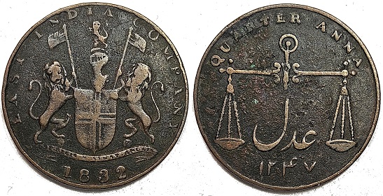 mint: Ob. Crowned bust of Queen Victoria left, divided English legend, toothed rim Lettering: VICTORIA QUEEN Rev. Denomination and date within circle of beads, wreath surrounds, toothed rim Lettering: ONE QUARTER ANNA INDIA 1862 1862 quarter Anna AE g; mm KM468; mintage: Edge - Engraver: William Wyon Zeno # |
