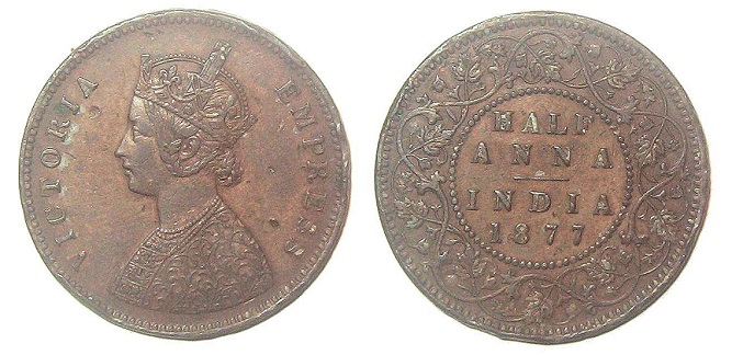 mint: Bombay Ob. Crowned bust of Queen Victoria left, divided English legend, toothed rim Lettering: VICTORIA EMPRESS Rev. Denomination and date within circle of beads, wreath surrounds, toothed rim Lettering: HALF ANNA INDIA date 1877 half Anna Copper 12.8g; 31.15mm KM487; mintage: 3,454,144 Edge - Plain Engraver: William Wyon Zeno #235482 |