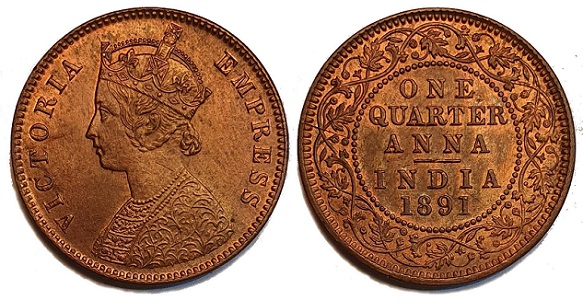 mint: Calcutta Ob. Crowned bust of Queen Victoria left, divided English legend, toothed rim Lettering: VICTORIA EMPRESS Rev. Denomination and date within circle of beads, wreath surrounds, toothed rim Lettering: ONE QUARTER ANNA 1897 1891 quarter Anna Copper 6.4g; 25mm KM486; mintage: 82,909,000 Edge - Plain Engraver: William Wyon Zeno #276027 |