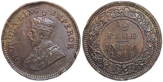 mint: Calcutta Ob. Crowned head of George V facing left; GEORGE V KING EMPEROR Rev. Denomination and date within circle of beads, wreath surrounds; 1/2 PICE INDIA; date 1915 half Pice Bronze 2.4g; 21.05mm KM510; mintage: 5,734,400 Edge - Plain Engraver: Edgar Bertram MacKennal |