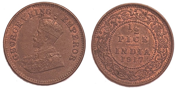 mint: Calcutta Ob. Crowned head of George V facing left; GEORGE V KING EMPEROR Rev. Denomination and date within circle of beads, wreath surrounds; 1/2 PICE INDIA; date 1917 half Pice Bronze 2.4g; 21.05mm KM510; mintage: Edge - Plain Engraver: Edgar Bertram MacKennal |