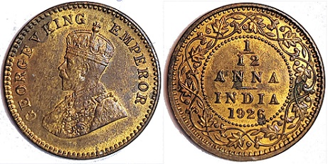 mint: Calcutta Ob. Crowned head of George V facing left; GEORGE V KING EMPEROR Rev. Denomination and date within circle of beads, wreath surrounds; 1/12 ANNA INDIA, date 1926 twelfth anna Bronze 1.65g; 17.4mm KM509; mintage: 4,147,000 Edge - Plain Engraver: Edgar Bertram MacKennal |