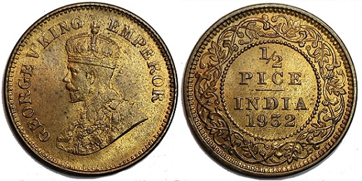 mint: Calcutta Ob. Crowned head of George V facing left; GEORGE V KING EMPEROR Rev. Denomination and date within circle of beads, wreath surrounds; 1/2 PICE INDIA; date 1932 half Pice Bronze 2.4g; 21.05mm KM510; mintage: Edge - Plain Engraver: Edgar Bertram MacKennal Zeno #301611 |