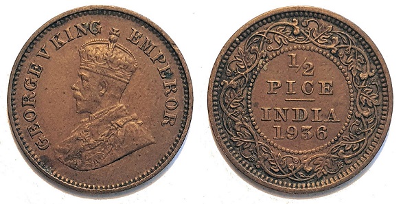 mint: Calcutta Ob. Crowned head of George V facing left; GEORGE V KING EMPEROR Rev. Denomination and date within circle of beads, wreath surrounds; 1/2 PICE INDIA; date 1936 half Pice Bronze 2.4g; 21.05mm KM510; mintage: Edge - Plain Engraver: Edgar Bertram MacKennal Zeno #255275 |