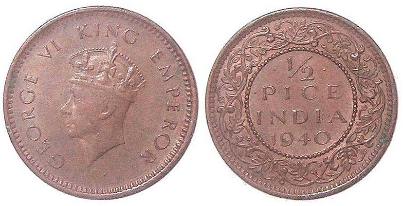 mint: Calcutta Ob. Crowned head of George V facing left; GEORGE VI KING EMPEROR Rev. Denomination and date within circle of beads, wreath surrounds; 1/2 PICE INDIA; date 1940 half Pice Bronze 2.4g; 21.1mm KM528; mintage: 23,770,000 Edge - Plain Engraver: Edgar Bertram MacKennal |