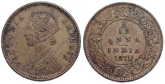 mint: Bombay mint Ob. Crowned bust of Queen Victoria left, divided English legend, toothed rim Lettering: VICTORIA EMPRESS Rev. Denomination and date within circle of beads, wreath surrounds, toothed rim Lettering: 1878 twelfth Anna AE 2.1g; 17.5mm KM483; mintage: Edge - plain Engraver: William Wyon Zeno # |