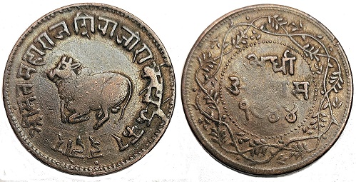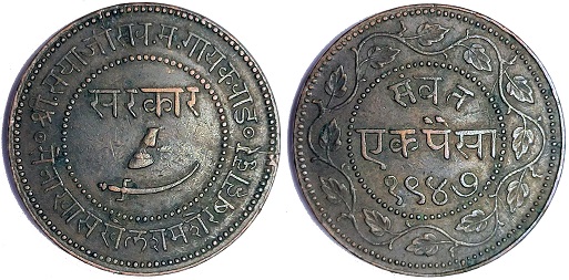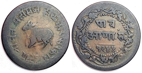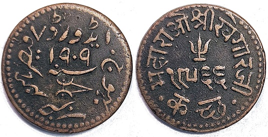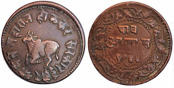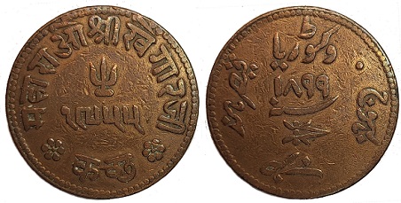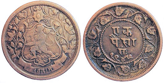 mint: Ob. Star on top of central shield containing Hanuman (the Hindu monkey God) walking left, holding a club in right hand, and an object in left hand. Flowers and plants outside shield. Three-fold ribbon at bottom, with lettering in central part. Beaded border Rev. Central beaded circle contains lettering of value and date in Vikram Samvat (equivalent to 1890 in CE). Flowers and plants around outside of circle, toothed border VS 1947 / 1890 AD Paisa AE 5.7g, 23.5mm KM24; N.16633; mintage: Edge - Engraver: Zeno # 317578 |
