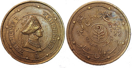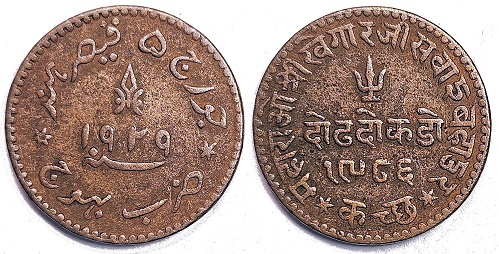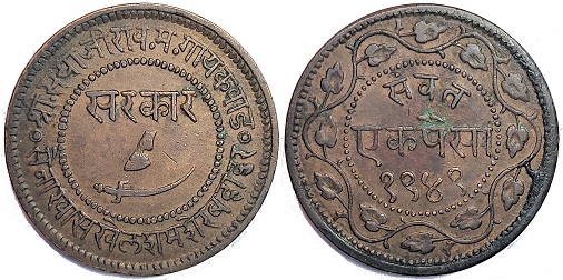 mint: Ob. Lord Hanuman Running to Right Rev. Teen Dokda Sanstana Nawanagar Sambat 1928 Paisa AE g, mm KM10; mintage: Edge - Engraver: |