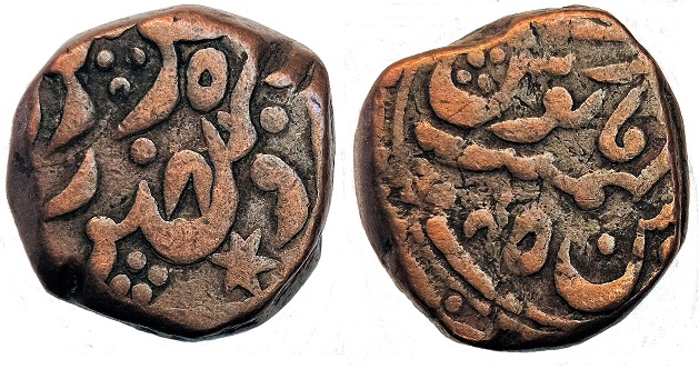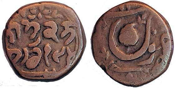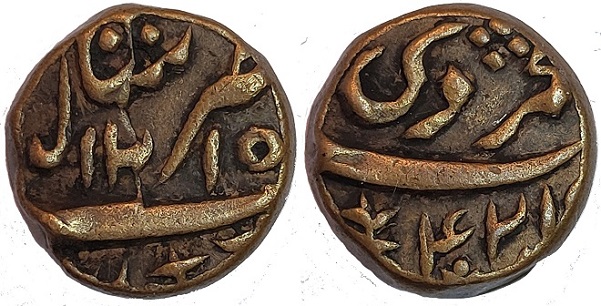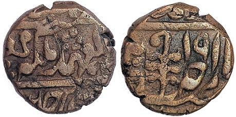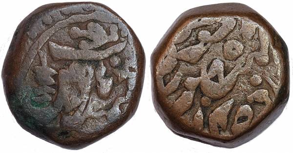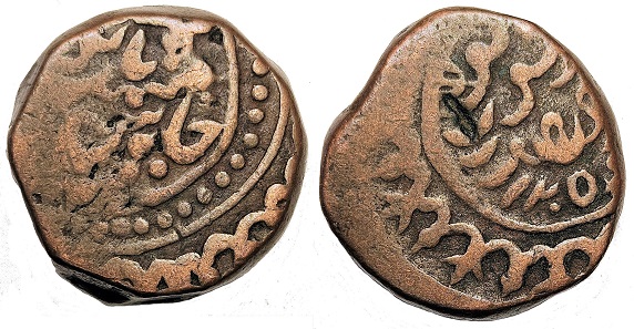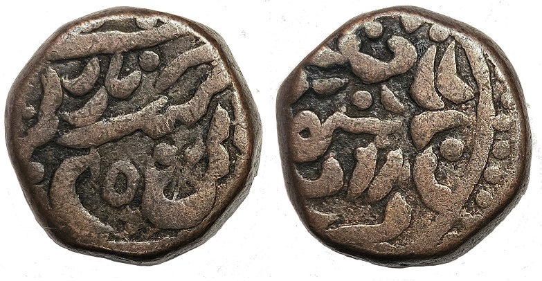 mint: Dehli, Narnol Ob. Rev. AH- AE half Dam 10.35g, 17mm KM; mintage: Edge - Engraver: Zeno #324163 |