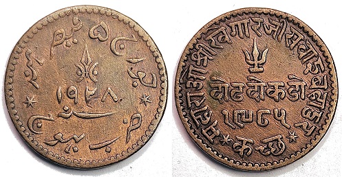 mint: Ob. Katar (Dagger) in Center surrounded by Inscriptions in Nagari Rev. Teen Dokda Sanstana Nawanagar Sambat 1928 VS1928 (1871) 3 Dokda AE g, mm KM17; mintage: Edge - Engraver: |