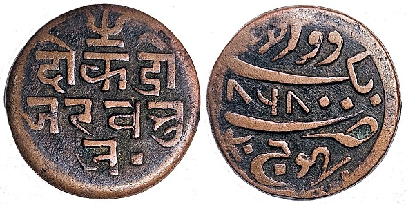 mint: Orchha Ob. Lord Hanuman Running to Right Rev. Teen Dokda Sanstana Nawanagar Sambat 1928 Paisa AH1219 Ry.4x 16.97g, 23mm KMKM C25; mintage: Edge - Engraver: Zeno #321731 |