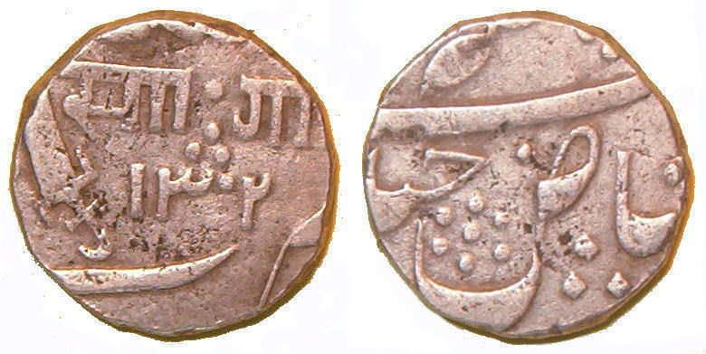 Dar al-Riyasat mint Ob. Sikka Mubarak zad za Fazal-i- Yazdan / Ra’ees-i- Tonk Ibrahim ‘Ali Khan’ (“Struck auspicious coin by the grace of God, Ibrahim Ali Khan, the Elite (king) of Tonk”); Feather/Turban ornament mint mark. Rev. ‘Ahdi malikah muazzam sultanat inglistan wa qaiser hindustan dar al-zarb Tonk’ AH1293 (1876/1877 AD) Rupee Silver mm g KM Zeno #138619 |