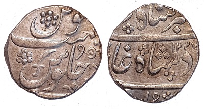 Jahanshi (Balwantnagar) mint Ob. Rev. AH1172 Ry6 Rupee Silver 22mm, 11.32g KM 143 Zeno #344222 |
