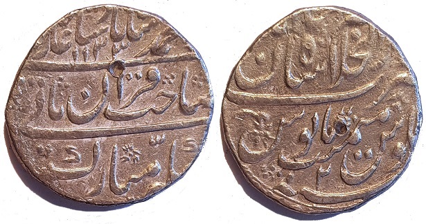 Surat mint Ob. Legend in Persian (mostly off flan): Sikka Mubarak Badshah ghazi Shah Alam Rev. Zarb Surat sanat 46 julus maimanat manus. RY 46 Ry.46 Rupee Silver 19mm, 11.50g KM-; Zeno #64455 Numista 79825 |