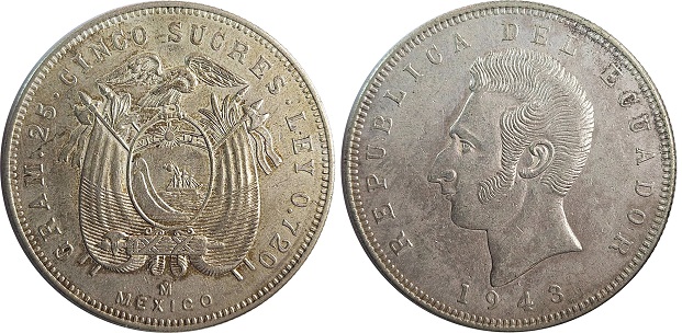Obverse: The flag of Ecuador draping the Ecuadorian coat of arms, denomination above Date: 1943 5 Sucres