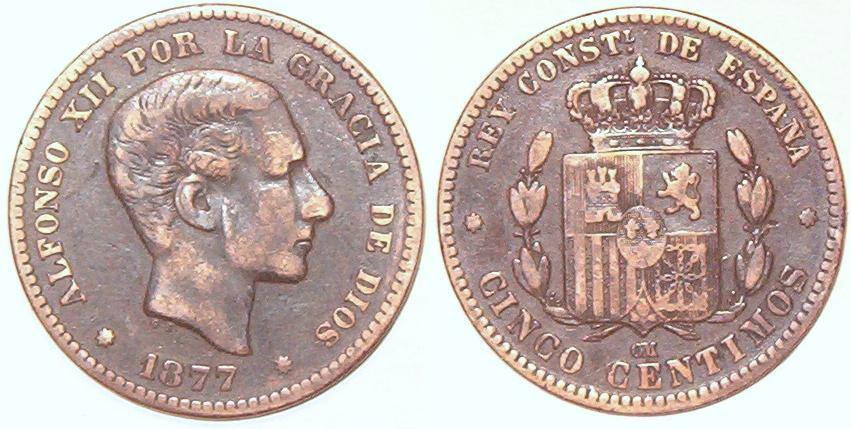 Obverse:ALFONSO XII POR LA GRACIA DE DIOS / G. S. / * date *· Reference: Numista 1246 Historical Note: The 1877 five‑céntimos issue belongs to the early Bourbon Restoration, when Alfonso XII returned to the throne after the upheavals of the Glorious Revolution, the short‑lived monarchy of Amadeo I, and the First Spanish Republic. Spain was attempting to re‑establish political stability and modernize its economy, and the introduction of small bronze denominations formed part of a broader monetary rationalization. The Barcelona Mint (La Seca), one of the most industrially advanced in the country, produced large quantities of these low‑value coins for everyday commerce. The legends emphasize both divine right and constitutional monarchy, reflecting the new regime’s effort to balance traditional legitimacy with the constitutional framework that defined Alfonso’s reign. These pieces circulated widely during a period of cautious recovery and administrative consolidation. |