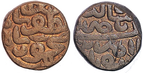 mint: Ahmadnagar Ob. Rev. 2/3 Falus AE 9.21g, 18mm N31/46; mintage: not known Edge - plain Note: |
