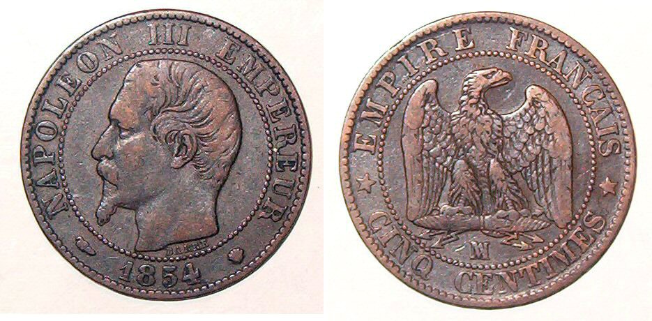 Obverse: NAPOLEON III EMPEREUR / BARRE. / date; Portrait facing left, inside beaded circle. Lettering around outside, date underneath Reference: Numista 485 Historical Note: The 1854 five‑centimes piece was issued in the early years of the Second French Empire, when Napoleon III was consolidating his authority and modernizing France’s economic infrastructure. Bronze small‑change coinage had become increasingly important as industrialization accelerated and urban markets expanded, and the Marseille Mint (MA) was one of several regional mints supplying the growing demand for low‑value currency. The imperial eagle on the reverse served as a powerful emblem of the new regime, echoing Napoleonic symbolism while projecting stability and centralized control. These copper centimes circulated widely among workers, artisans, and merchants, forming the everyday monetary backbone of an empire undergoing rapid modernization, urban growth, and ambitious public‑works reforms. |