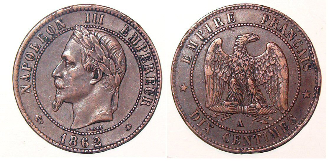 Obverse: NAPOLEON III EMPEREUR / BARRE. / date; Portrait facing left, inside beaded circle. Lettering around outside, date underneath Reference: Numista 480 Historical Note: The 1862 ten‑centimes piece was struck during the height of the Second French Empire, when Napoleon III was reshaping France through industrial expansion, railway building, and sweeping urban reforms. Bronze small‑change coinage had become essential for the daily life of an increasingly urban and wage‑based society, and the Paris Mint served as the central hub for producing these durable, machine‑struck coins. The imperial portrait by Barre reflects the neoclassical style favored by the regime, while the reverse design—with its clear value and imperial framing—projects the authority and stability Napoleon III sought to associate with his rule. These bronze centimes circulated widely among workers, artisans, and merchants, forming the practical monetary backbone of an empire undergoing rapid modernization and preparing to enter the competitive industrial landscape of mid‑19th‑century Europe. |