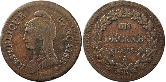 Obverse: REPUBLIQUE FRANÇAISE — Marianne with Phrygian cap. Reference: Numista 27075 Historical Note: The copper 5 centimes of Year 5 was struck during the Directory, a transitional and often unstable phase of the French First Republic following the radicalism of the Terror. Revolutionary iconography remained central: Marianne wearing the Phrygian cap symbolized liberty, civic virtue, and the break with monarchy, while the oak wreath on the reverse evoked republican strength and endurance. France was still grappling with severe inflation, metal shortages, and the need to replace royal coinage with fully republican types, making these large copper pieces an important part of everyday commerce. The dating by revolutionary calendar further reflects the regime’s attempt to redefine time, society, and national identity in the wake of 1789. |