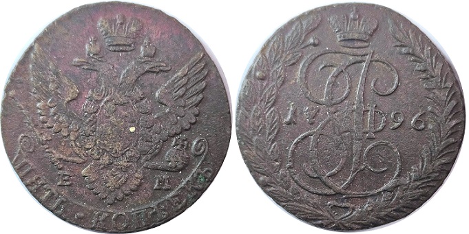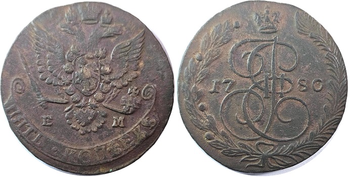 Obverse:Crowned monogram of Ekaterina II divides date within wreath.· Reference: Numista 8257 Historical Note: The large 5‑kopeck pieces of Catherine II are emblematic of Russia’s late‑18th‑century monetary system, which relied heavily on substantial copper denominations for everyday transactions across the empire’s vast territories. Ekaterinburg Mint, situated in the mineral‑rich Urals, became one of the principal producers of these heavy coppers, drawing on abundant local resources. The crowned monogram on the obverse reflects Catherine’s consolidation of autocratic authority, while the double‑headed eagle on the reverse underscores Russia’s imperial identity during a period of territorial expansion and administrative reform. These coins circulated widely and often for decades, their size and durability making them a familiar presence in both urban markets and rural trade. |