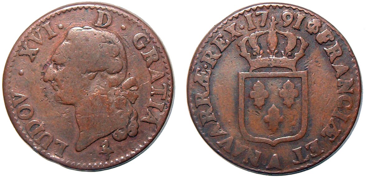 Obverse: LUDOV·XVI·D·GRATIA / Portrait of King Louis XVI facing left Reference: Numista 4944 Historical Note: The 1785 sizain represents the low‑value copper currency that underpinned everyday commerce in the final years of the Ancien Régime. While France’s higher denominations were struck in silver and gold, small copper pieces like this were essential for market transactions, wages, and rural trade, especially in a kingdom where shortages of small change were chronic. The Paris Mint produced large quantities of these fractional coins to stabilize circulation, yet they still struggled to meet demand as France’s financial crisis deepened in the 1780s. The crowned fleur‑de‑lis shield and the portrait of Louis XVI preserve the traditional Bourbon iconography that would soon disappear with the Revolution. These late copper issues circulated widely into the early 1790s, bridging the transition from royal authority to the radically restructured monetary system of Revolutionary France. |
