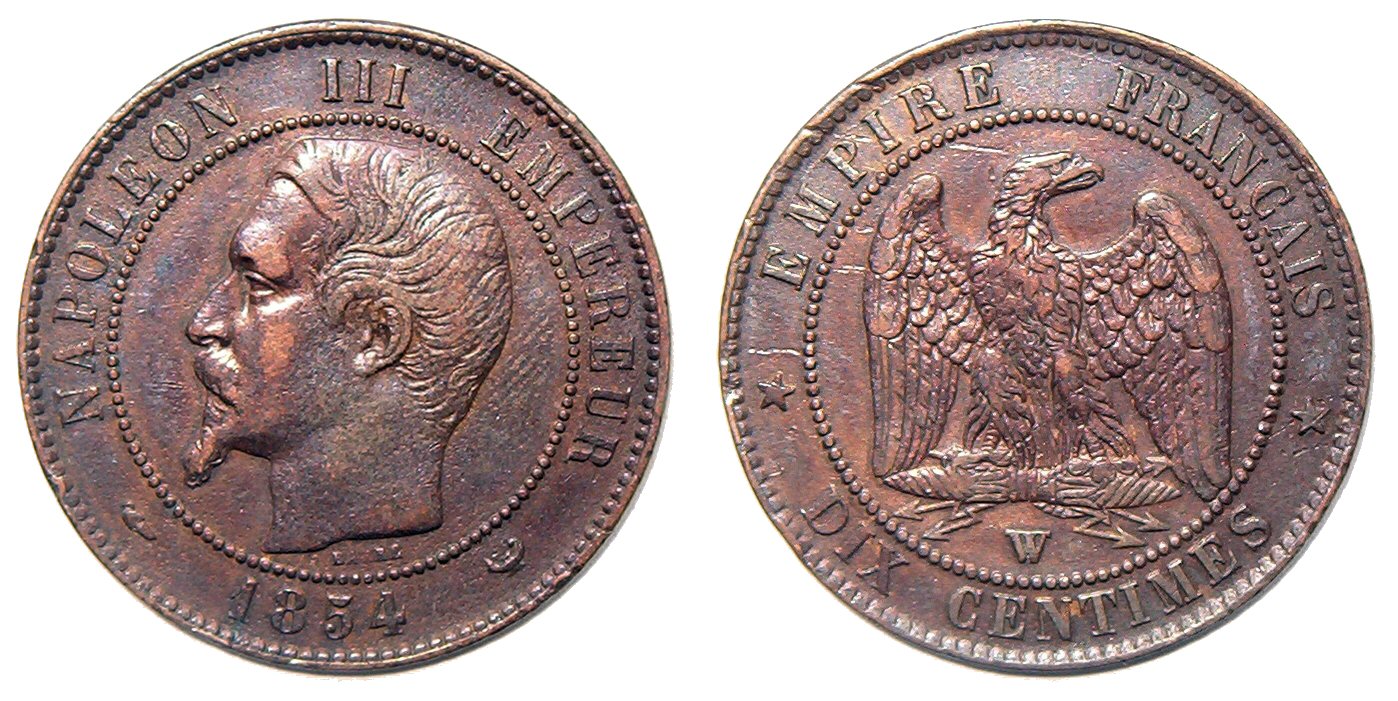 Obverse: NAPOLEON III EMPEREUR / BARRE. / date; Portrait facing left, inside beaded circle. Lettering around outside, date underneath Reference: Numista 320 Historical Note: The 1854 ten‑centimes issue was struck during the formative years of the Second French Empire, when Napoleon III was reshaping France through rapid industrialization, railway expansion, and sweeping urban reforms. Copper and bronze small‑change coinage became increasingly important as wages, market transactions, and urban commerce demanded reliable low‑value currency. The Lille Mint, identified by the letter W, was one of several regional mints tasked with meeting this growing monetary need. The imperial eagle on the reverse—reviving the Napoleonic emblem of authority and military prestige—served as a clear visual statement of the new regime’s legitimacy. These sturdy bronze centimes circulated widely among workers and merchants, forming the everyday monetary foundation of an empire undergoing profound economic and social transformation. |