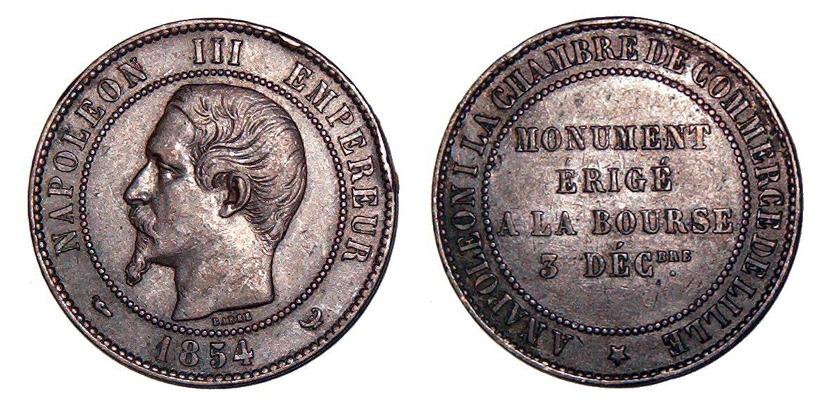 Obverse: NAPOLEON III EMPEREUR / BARRE. / date; Portrait facing left, inside beaded circle. Lettering around outside, date underneath Reference: Numista 19233 Historical Note: This 1854 bronze issue is not a regular circulating 10‑centimes coin but a commemorative token struck under Napoleon III to mark the monument erected by the Lille Chamber of Commerce in honor of Napoleon I. During the early Second Empire, such medals and medal‑like pieces were commonly produced by the Paris Mint to celebrate civic achievements, commercial institutions, and the revival of Napoleonic symbolism. The obverse retains the official imperial portrait used on circulating coinage, reinforcing the continuity of the Bonaparte dynasty, while the reverse inscription commemorates the Chamber’s dedication ceremony at the Lille Bourse on 3 December. These pieces circulated informally as souvenirs and promotional tokens rather than as legal tender, reflecting the era’s blend of imperial propaganda, civic pride, and the growing influence of regional commercial bodies within an increasingly industrialized France. |