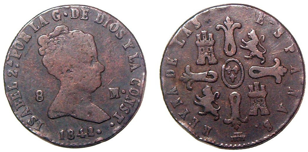 Obverse:ISABEL 2ᴬ. POR LA G· DE DIOS Y LA CONST· / 8 M. / date· Reference: Numista 4402 Historical Note: The 1842 eight‑maravedís issue was struck during the regency period that followed the First Carlist War, when the young Isabella II had only recently been proclaimed queen. Spain was undergoing intense political turbulence, alternating between liberal and moderate governments while attempting to rebuild its finances after years of conflict. The Segovia Mint—famous for its historic water‑powered machinery—continued to produce low‑value copper coinage essential for everyday commerce. The legends emphasize both divine right (*por la gracia de Dios*) and constitutional legitimacy, reflecting the monarchy’s attempt to balance tradition with the liberal reforms that had secured Isabella’s succession. These late maravedís pieces represent the final decades of the denomination before Spain’s major monetary reforms of the 1850s. |