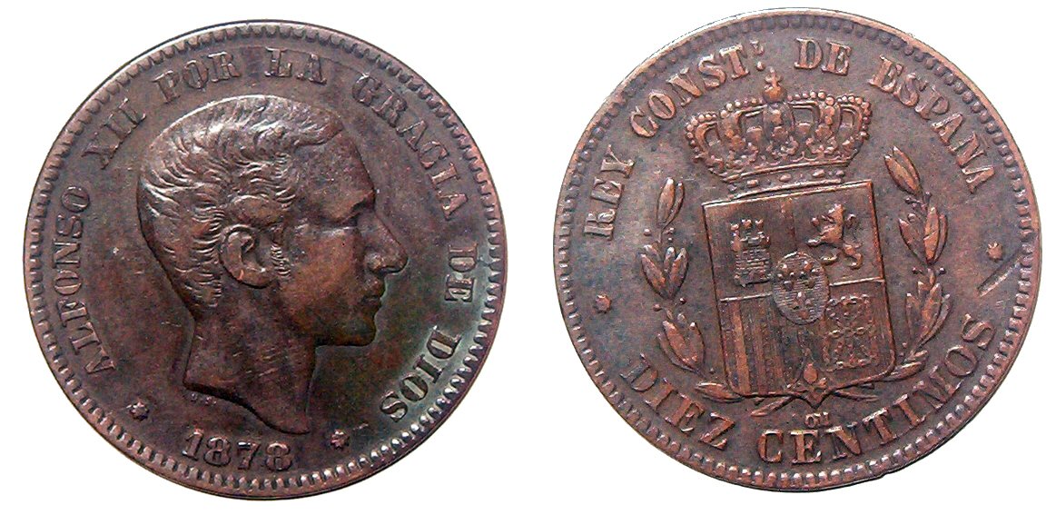 Obverse:ALFONSO XII POR LA GRACIA DE DIOS / G. S. / * date *·· Reference: Numista 1246 Historical Note: The 1878 ten‑céntimos issue was struck during the early Bourbon Restoration, only a few years after Spain had endured the Glorious Revolution, the brief reign of Amadeo I, and the First Republic. Alfonso XII’s accession in 1874 marked a return to monarchical stability, and the new regime prioritized modernizing the currency system, replacing the old maravedí‑based structure with decimal céntimos. The Barcelona Mint (La Seca), one of Spain’s most technologically advanced facilities, produced large quantities of these bronze coins to meet the needs of a rapidly industrializing economy. Their straightforward design—value and constitutional title—reflects the Restoration’s attempt to project order, legality, and a balanced constitutional monarchy after a decade of political upheaval. |